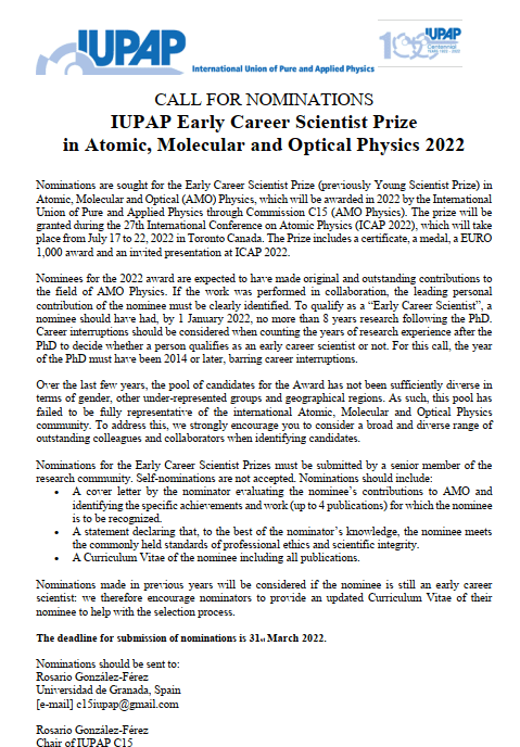 Está abierto el plazo para enviar nominaciones para el Premio «Early Career Scientist Prize» en Atomic, Molecular and Optical Physics 2022, de la International Union of Pure and Applied Physics (IUPAP).