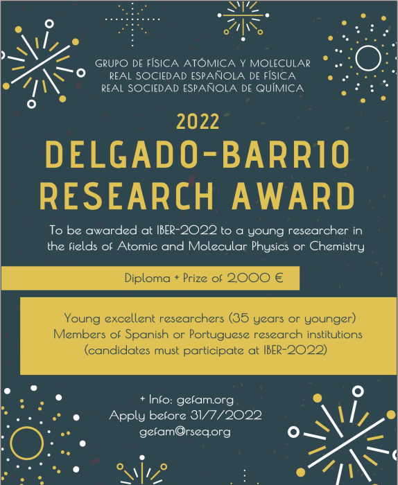 The Group of Atomic and Molecular Physics (GEFAM) of the Spanish societies of Physics (RSEF) and Chemistry (RSEQ) announces the 2022 edition of the Delgado-Barrio award, consisting of a Diploma and a monetary prize of 2000 euros (minus taxes). The prize has been established by the family of the late Prof. Gerardo Delgado-Barrio, founder and first President of GEFAM and President of the Spanish Society of Physics in the period 1997-2005. The 2022 Delgado-Barrio award will be presented by the widow of Prof. Delgado-Barrio at the gala dinner of the next XVI Joint Iberian Meeting on Atomic and Molecular Physics (IBER-2022) in Málaga (September 21-23, 2022).
