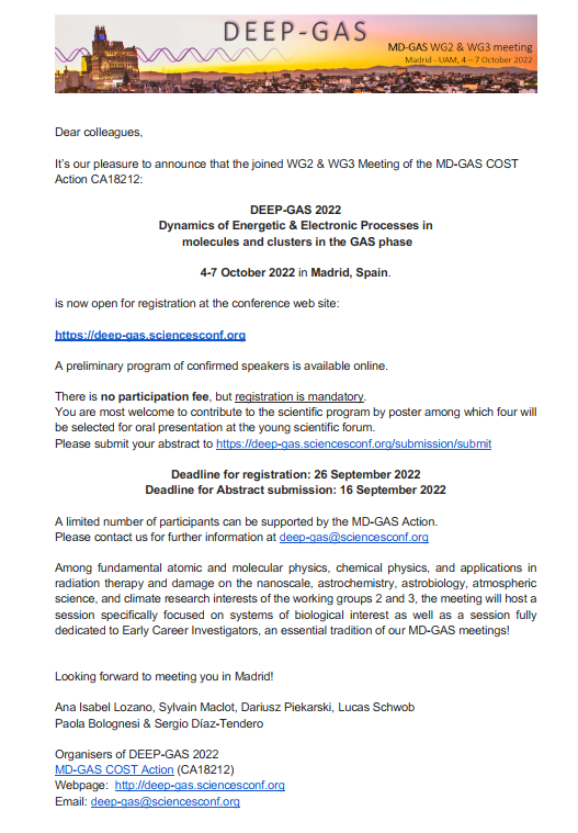 It’s our pleasure to announce that the joined WG2 & WG3 Meeting of the MD-GAS COST Action CA18212: DEEP-GAS 2022, Dynamics of Energetic & Electronic Processes in molecules and clusters in the GAS phase taking place 4-7 October 2022 in Madrid, Spain is now open for registration at the conference web site: