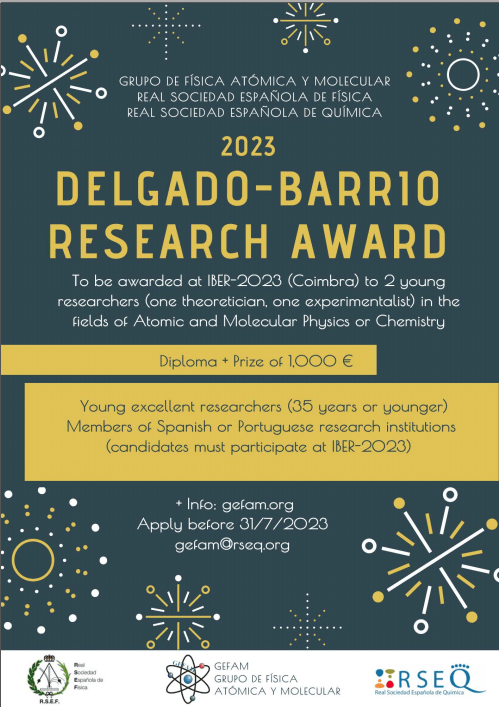 The Group of Atomic and Molecular Physics (GEFAM) of the Spanish societies of Physics (RSEF) and Chemistry (RSEQ) announces the 2023 edition of the Delgado-Barrio award, for excellent young researchers, one experimentalist and one theoretician, consisting of a Diploma and a monetary prize of 1000 euros (minus taxes) for each researcher. The prize has been established by the family of the late Prof. Gerardo Delgado-Barrio, founder and first President of GEFAM and President of the Spanish Society of Physics in the period 1997-2005. The 2023 Delgado-Barrio award will be presented by the widow of Prof. Delgado-Barrio at the gala dinner of the next XVII Joint Iberian Meeting on Atomic and Molecular Physics (IBER-2023) in Coimbra, Portugal (September 5-8, 2023).