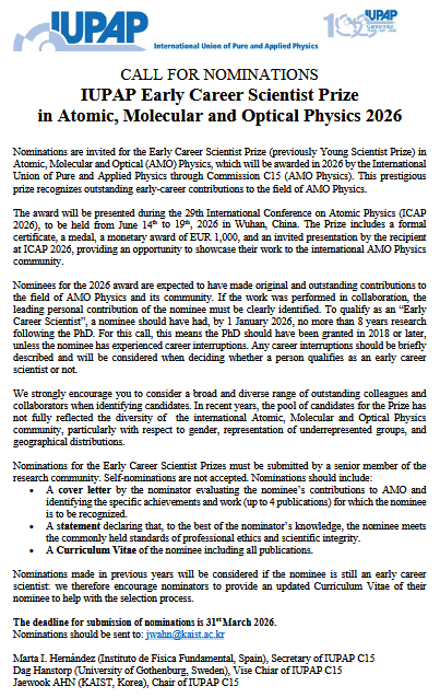 Nominations are invited for the Early Career Scientist Prize (previously Young Scientist Prize) in Atomic, Molecular and Optical (AMO) Physics, which will be awarded in 2026 by the International Union of Pure and Applied Physics through Commission C15 (AMO Physics). This prestigious prize recognizes outstanding early-career contributions to the field of AMO Physics.